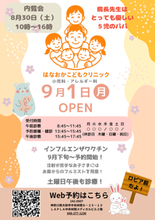 休診日:日、木、祝祭日13 : 45 ~ 15 : 30 は予防接種・乳幼児健診の時間の為、一般診療は受け付けておりません。